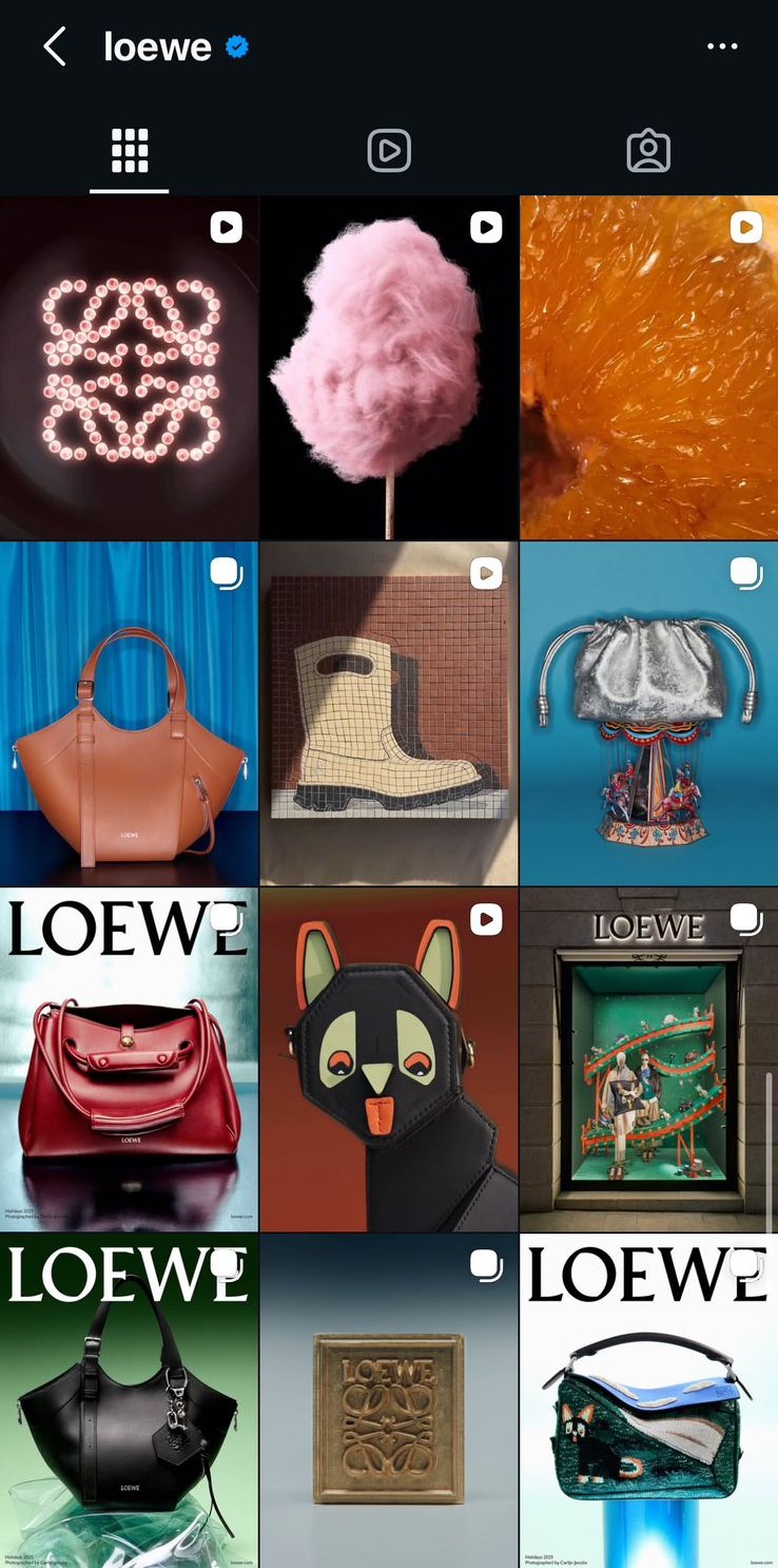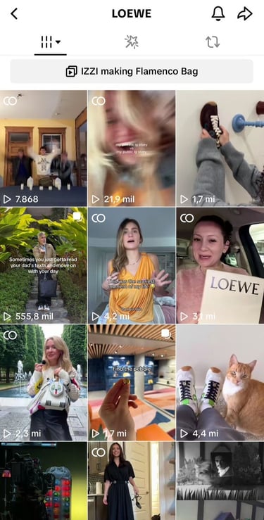 A LOEWE usa o Instagram e o TikTok de formas distintas: na última, ela tem um conteúdo mais leve, com humor e trends e no Instagram ela traz algo mais conceitual e polido.