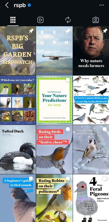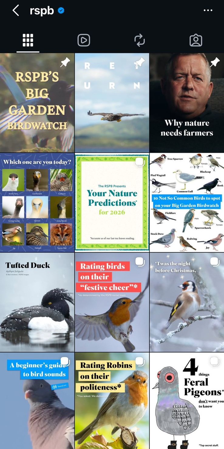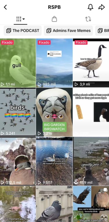 Outro exemplo são as redes da ONG Royal Society for the Protection of Birds (RSPB). Olha a diferença entre o Instagram (mais educativo) e o TikTok (mais descontraído):